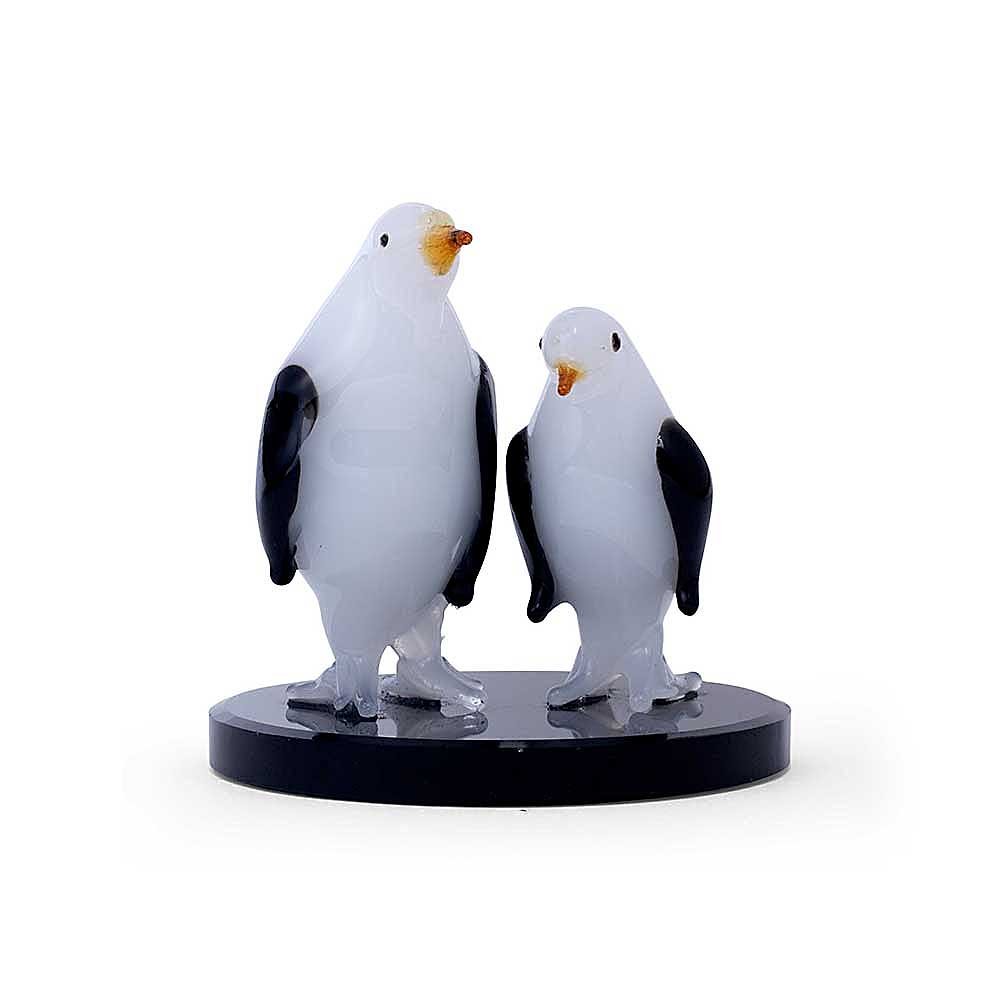 The penguins are sculpted from high-quality glass, creating a sparkling ice-like effect reminiscent of their natural habitat. The artisans have paid meticulous attention to detail, expertly capturing the penguins’ rounded belly, streamlined body shape, and characteristic beak. The eyes are rendered as small dark glass beads, giving the figure a lifelike gaze.