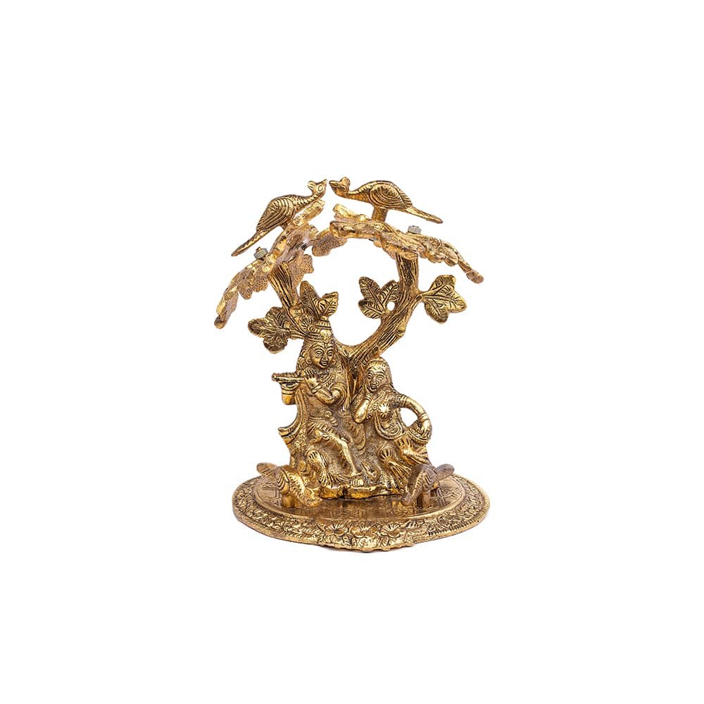 The showpiece depicts the divine couple Radha and Krishna sitting together under a tree, capturing a moment of eternal love and devotion. The entire piece is crafted in a rich golden colour, giving an opulent and timeless appearance.