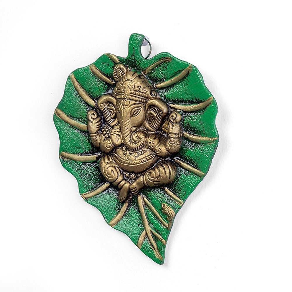 The backdrop of the wall hanging features a vibrant green leaf, creating a striking contrast that highlights the golden Ganpati Ji. The green leaf not only enhances the visual appeal but also symbolizes growth, prosperity, and renewal, aligning perfectly with the auspicious nature of Ganpati Ji.