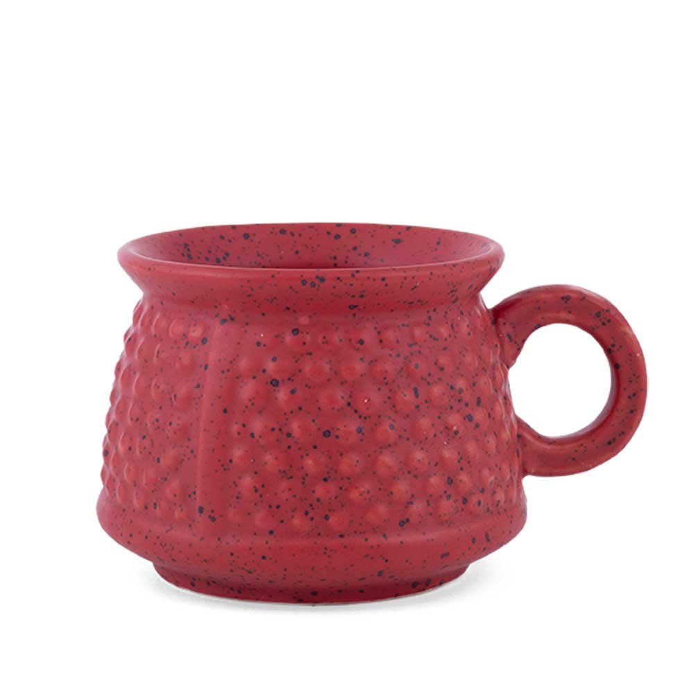 A vibrant, crimson-hued cup stands ready to use. Its bold scarlet tone catches the eye, making it easy to spot among other kitchenware. This handmade cup is designed to withstand daily use and occasional drops.