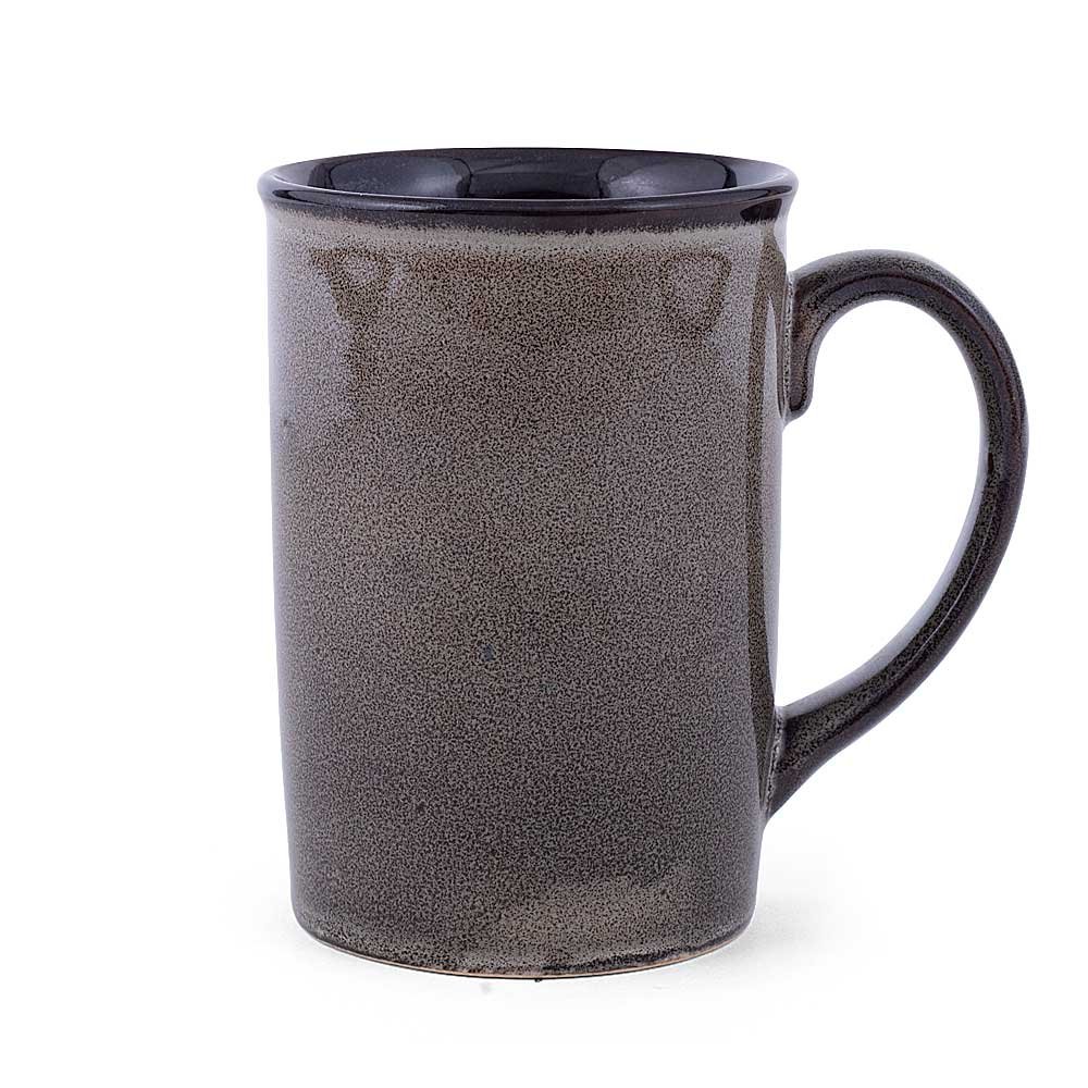 The black interior of the mug provides a dramatic backdrop that accentuates the rich colours of your coffee, tea, or any hot drink. The greyish exterior features a subtle, yet sophisticated shine, enhancing its modern aesthetic. The smooth, glossy finish feels luxurious to the touch.