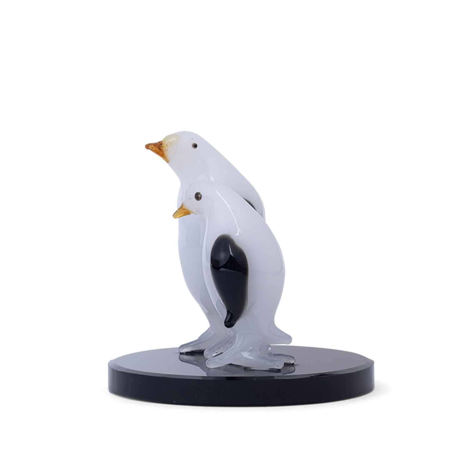 The penguins are sculpted from high-quality glass, creating a sparkling ice-like effect reminiscent of their natural habitat. The artisans have paid meticulous attention to detail, expertly capturing the penguins’ rounded belly, streamlined body shape, and characteristic beak. The eyes are rendered as small dark glass beads, giving the figure a lifelike gaze.